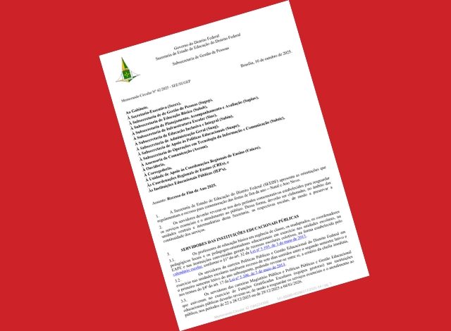 A Subsecretaria de Gestão de Pessoas da Secretaria de Educação do Distrito Federal (Sugep/SEEDF) publicou, no último dia 10 de outubro, o Memorando Circular nº 42/2025, com as orientações para o recesso de fim de ano nas unidades escolares, coordenações regionais e sedes administrativas da pasta. As regras são válidas para o período entre o final de dezembro de 2025 e o início de janeiro de 2026.